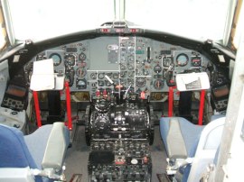 BAC 111 cockpit. This cockpit looks a little cramped and cluttered to me compared to the VC10. Those note tables look precarious too, for maps or drinks.