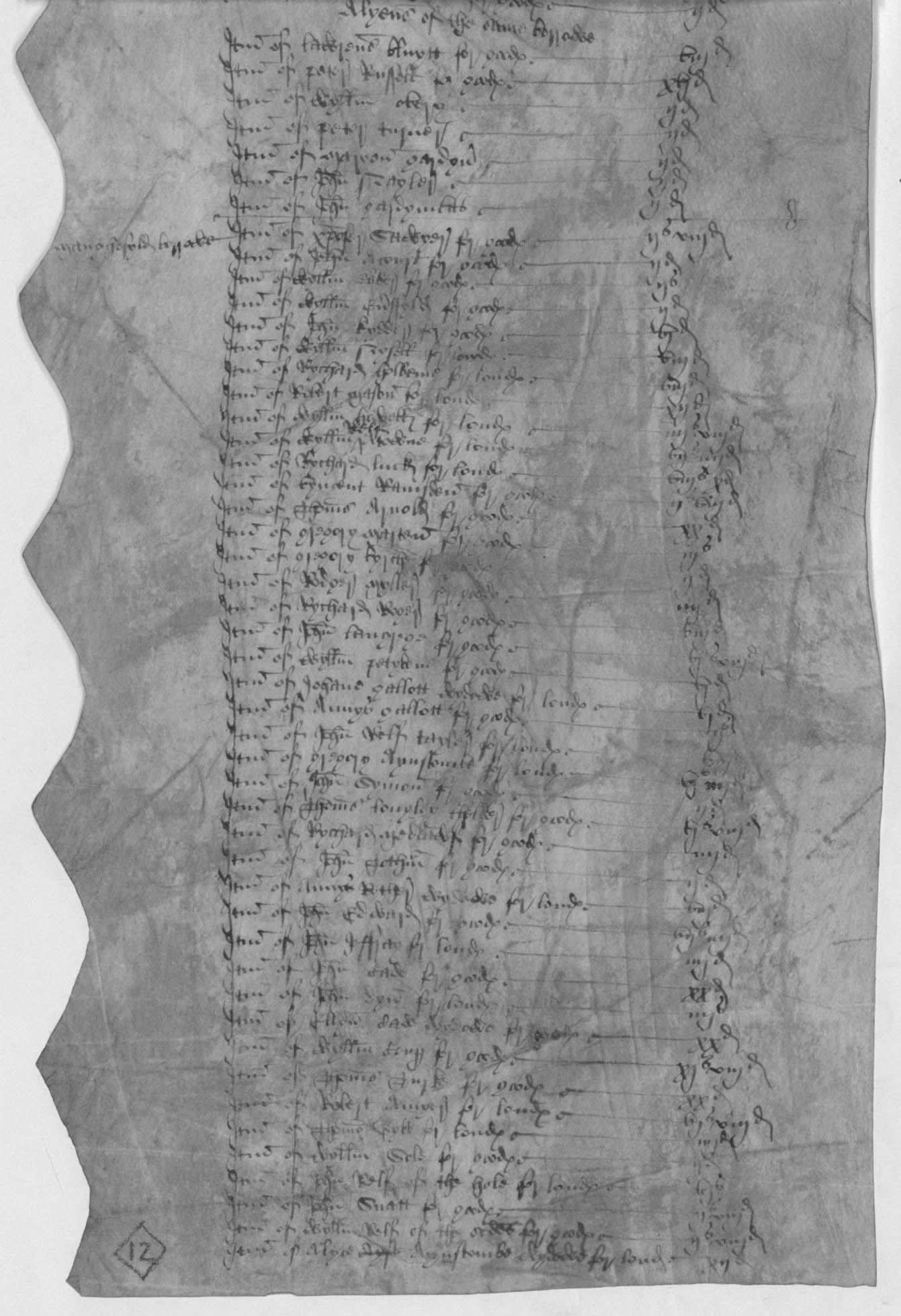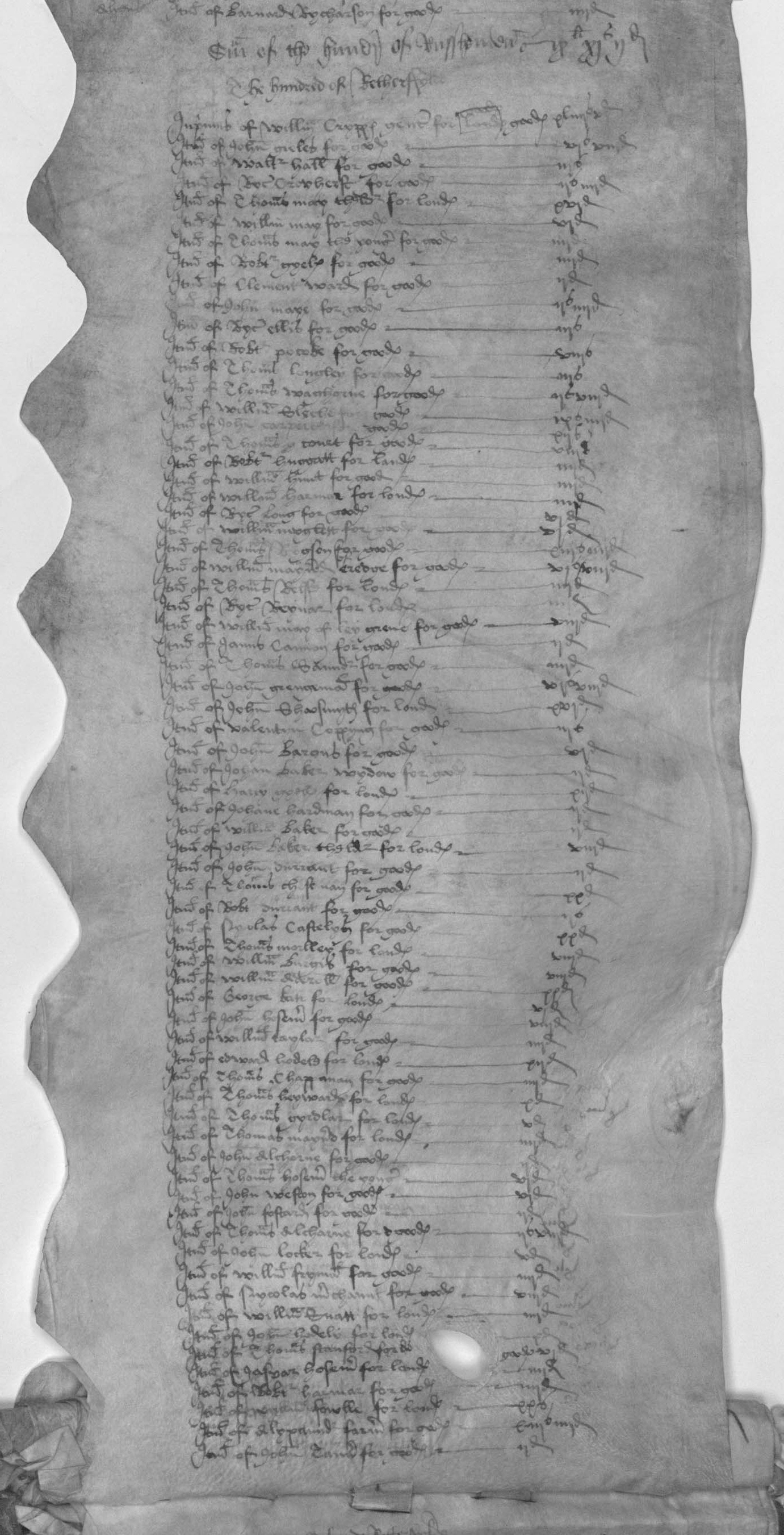Rots 25-26: Certificate and assessment of Chichester rape, the certificate dated 15 April 1550, and the assessment endorsed with a return date of 28 April 1550. These two rots are extremely wide and have been folded down the middle to fit them into the roll, being stitched only along half their connecting edges. Readers should open them out with care.